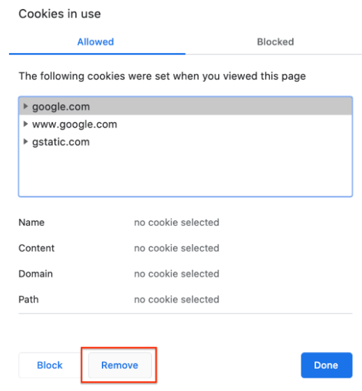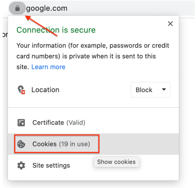 Section titled “Step 2: Clear Your Cookies.”- Click the lock icon next to the URL of the page (in this example we use google.com but you’ll want to use the actual page that isn’t loading)