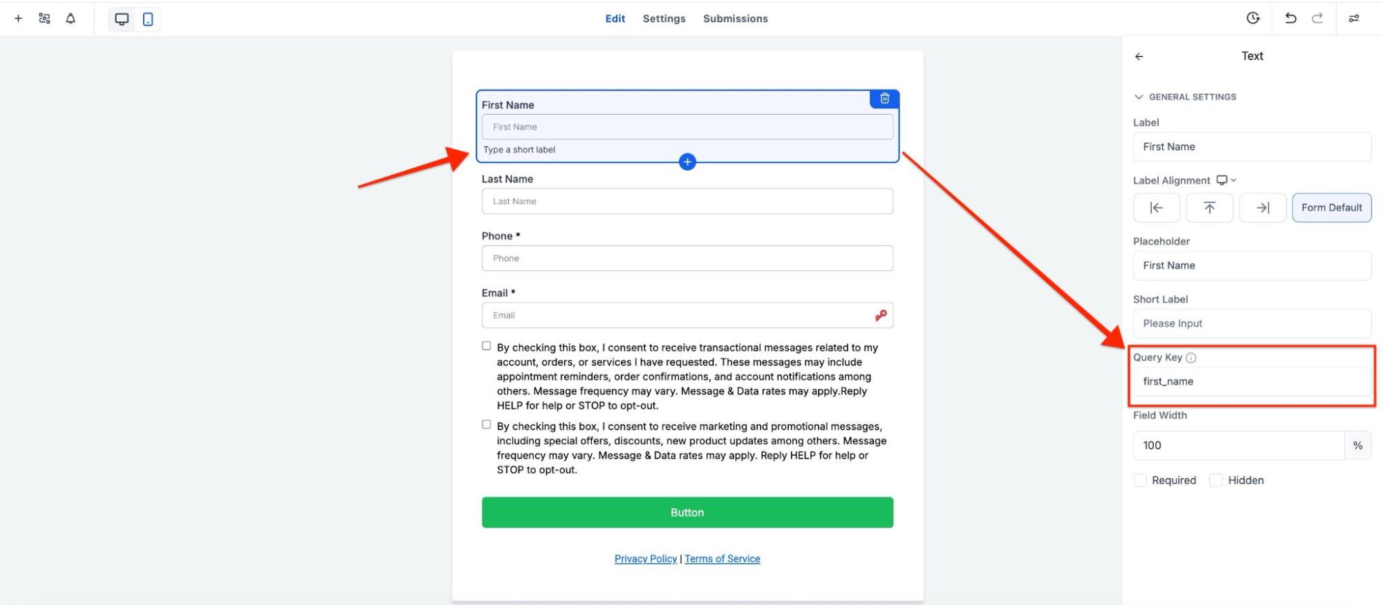 Select Fields for Data Transfer: Identify the fields whose information you intend to pass. Click on each field to access the Query String option within the right-side menu. Repeat this step for all pertinent fields. Eg, for the contact’s first name:
