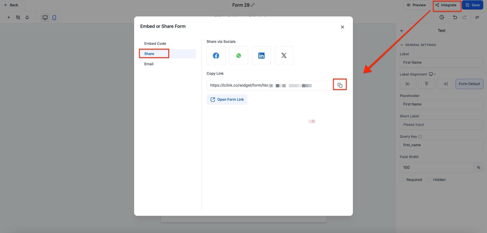 - Step 3: Retrieve the form’s URL by clicking on the “Integrate” button at the top of the form interface.