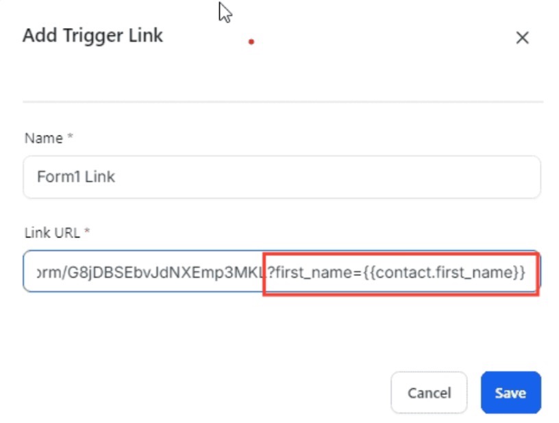 Configure Query String Parameters: Customize the trigger link by appending query string parameters for each field to the form’s link. For instance, to pass the contact’s first name, incorporate the query string retrieved from the form followed by the desired value to the end of the form’s link in the trigger link. Syntax: ?first_name={{contact.first_name}}. To include additional fields, use the ’&’ symbol to separate each parameter, maintaining the same syntax.