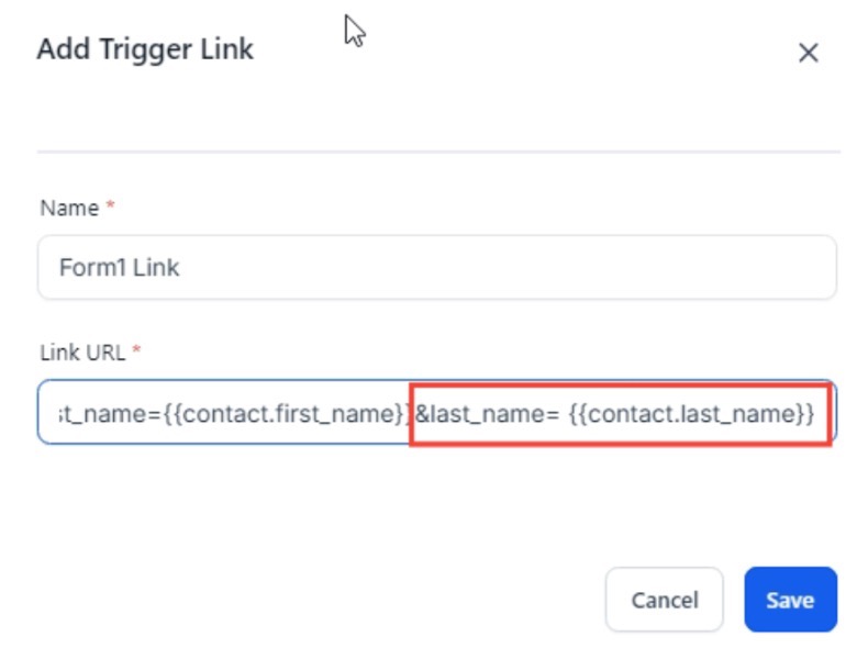 Complete Configuration: Finalize the trigger link setup by accurately including query string parameters for all desired fields. eg. If you want to pass the last name field as well, you will need to add & and follow the same syntax