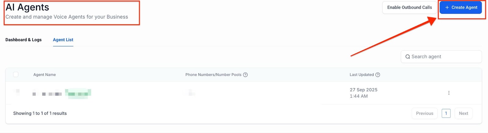 2. Once in the AI Agents section, click + Create Agent to start setting up a new Voice AI Agent.