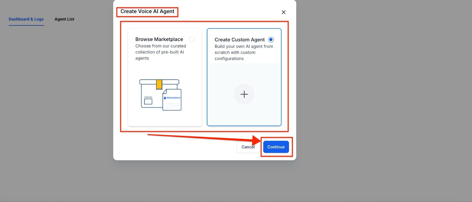 3. A pop-up will appear that will give you the options: Browse Marketplace or Create Custom Agent. For this tutorial, we will go with the latter.