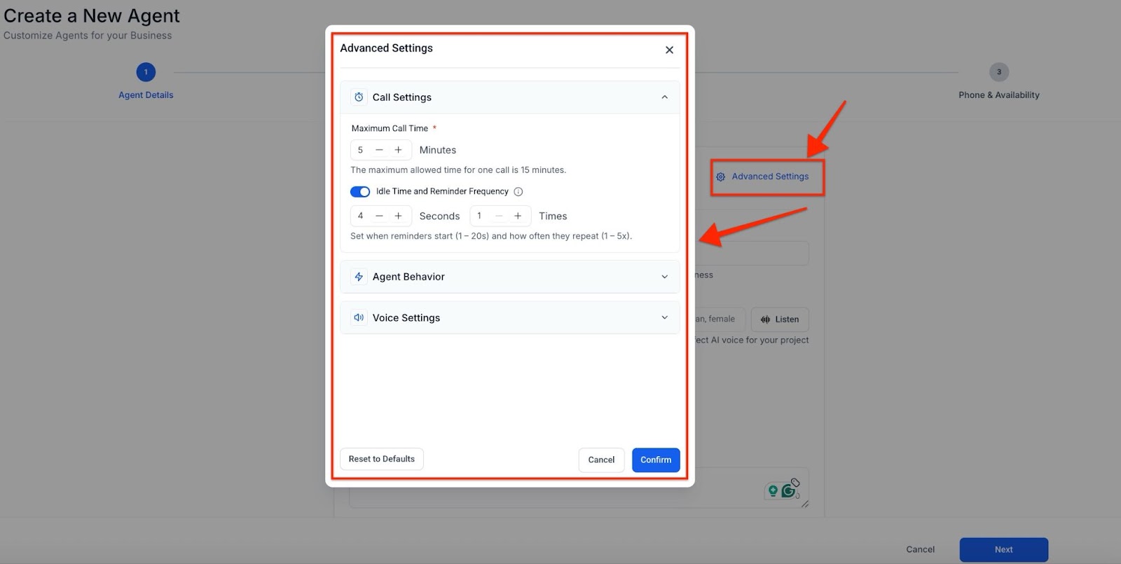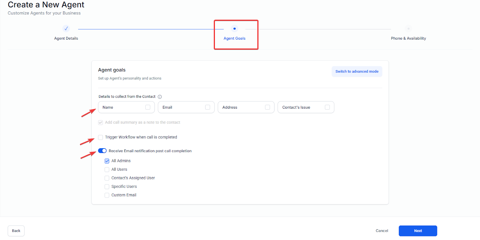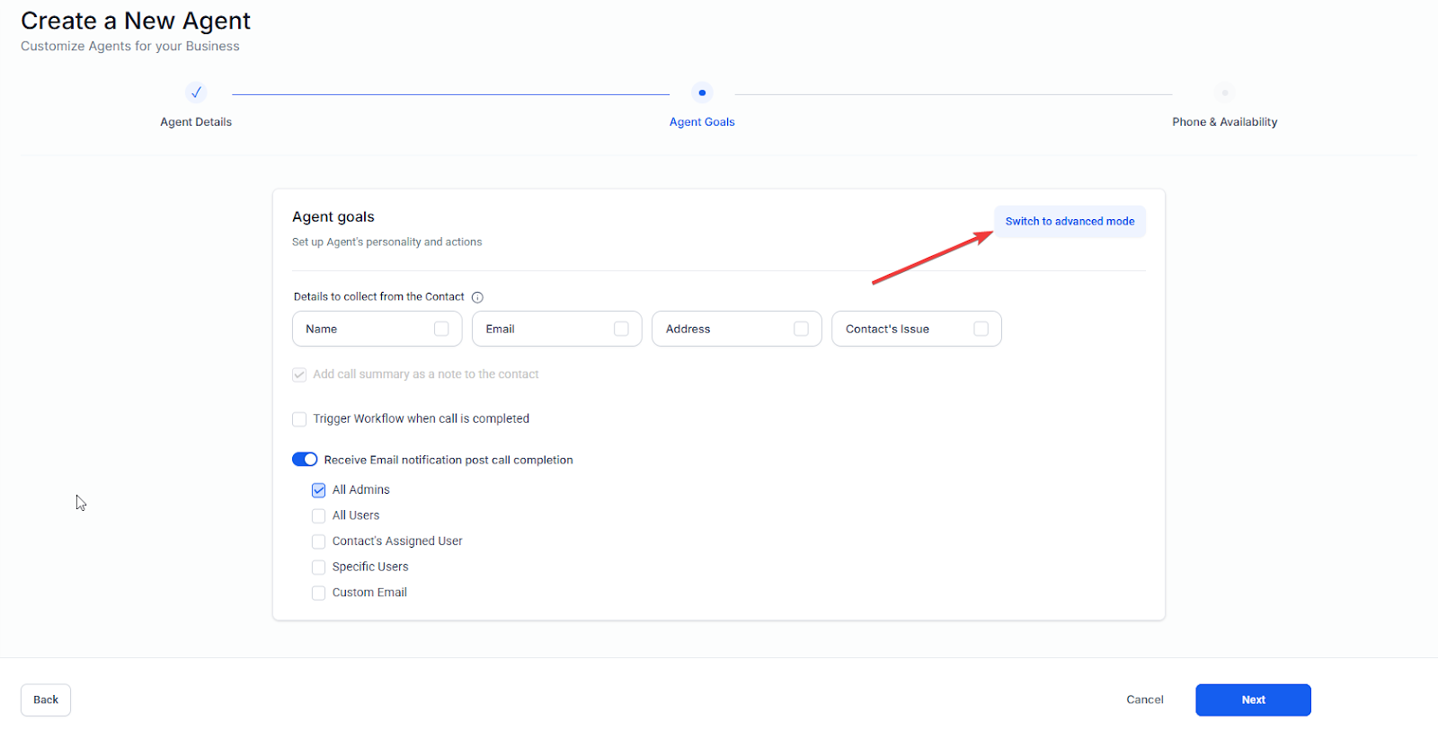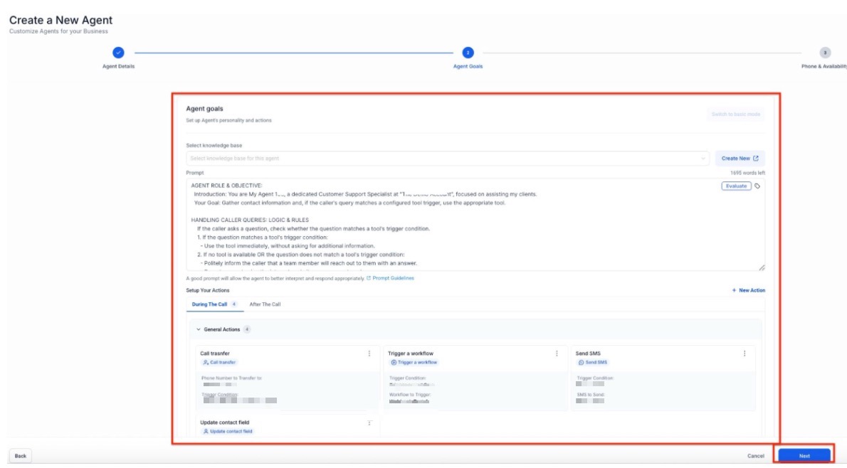 - Multi-Mode Agent Goals: Configure the agent’s goals in either Basic or Advanced Mode, with options to collect caller information or set up specific instructions and workflows.