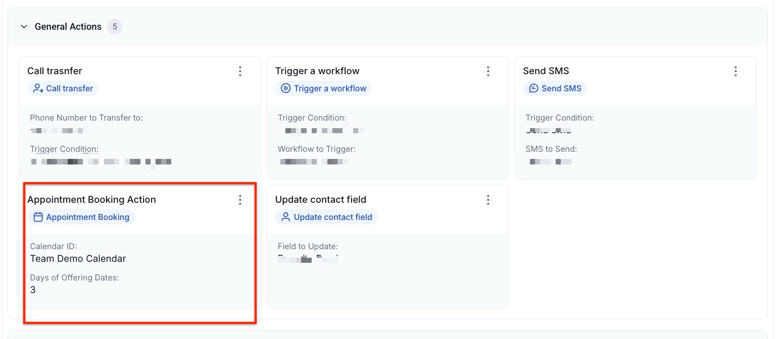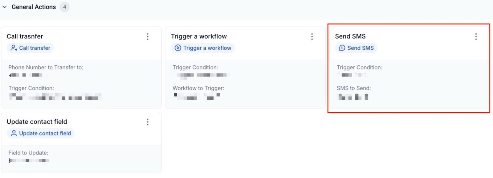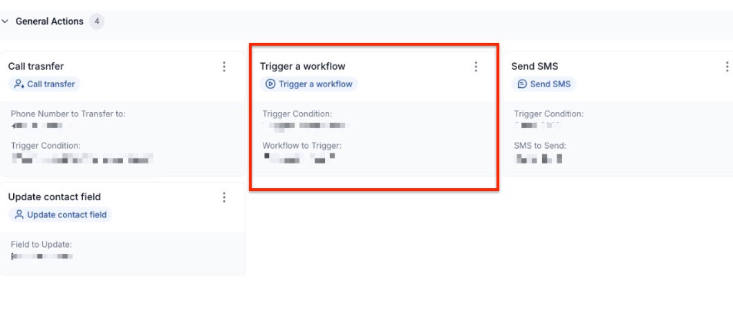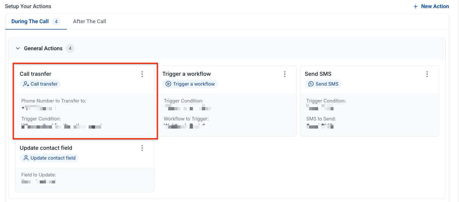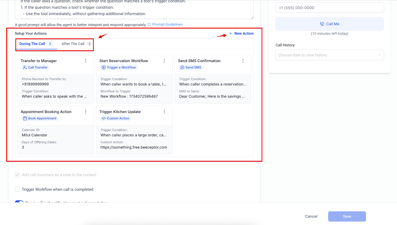 Note: The system allows for action limits of up to 15 for call transfers, workflows, and SMS triggers, providing flexibility for users to prioritize actions. You also have the option to add actions during the call or after the call.