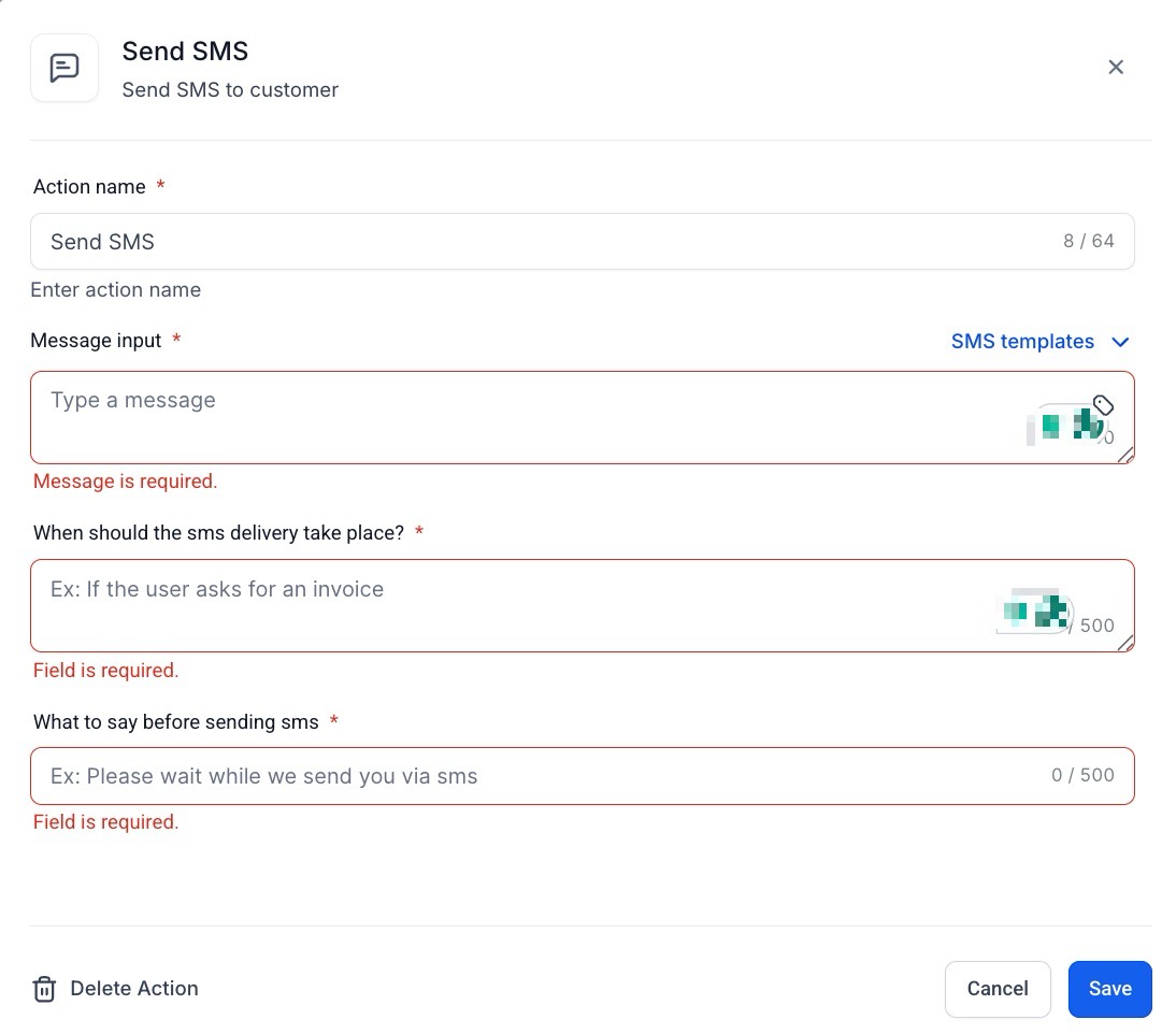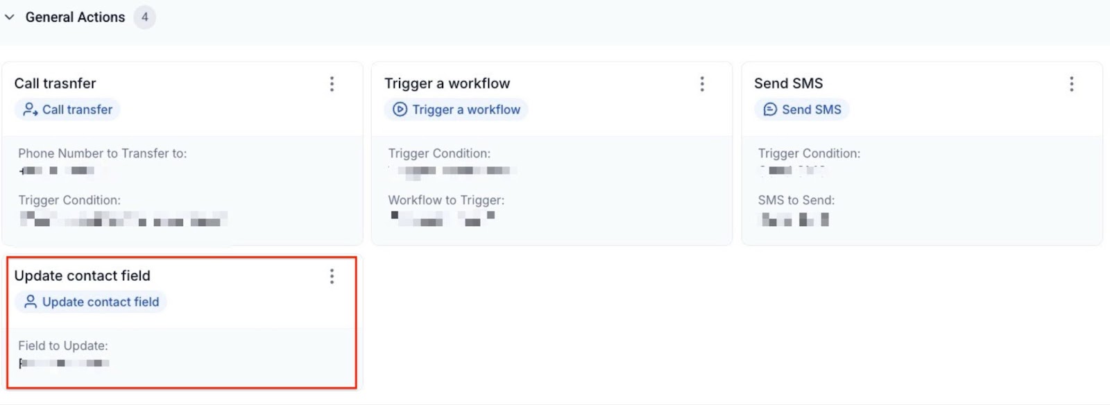 Voice AI can automatically extract numbers, monetary values, and postal codes during voice interactions. Create an “Update Contact Field” action and choose the relevant fields (e.g., ticket ID, budget, postal code).