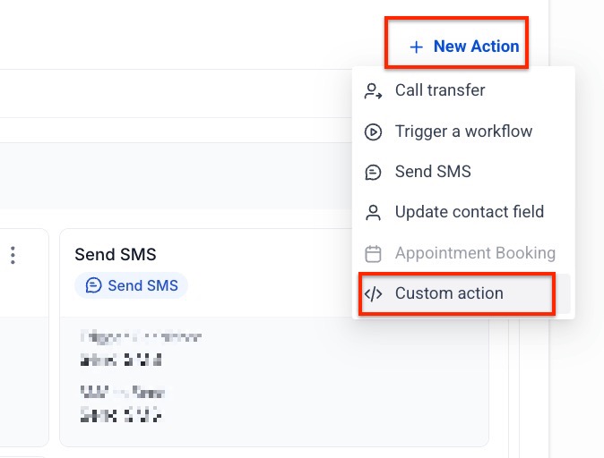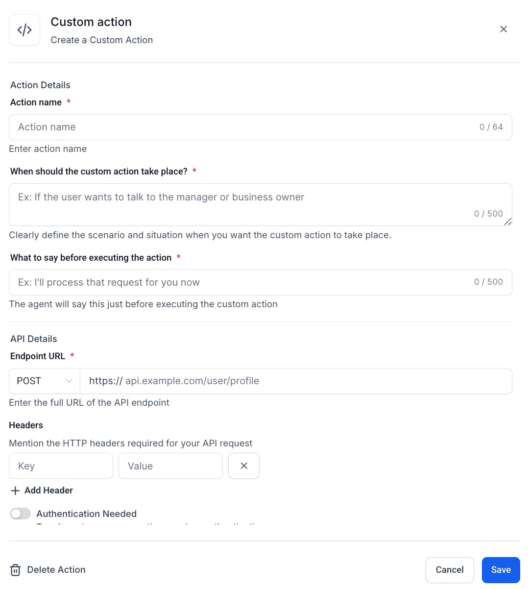 Note: Custom Actions work with POST Webhook calls and support authentication, headers, and dynamic parameters.
