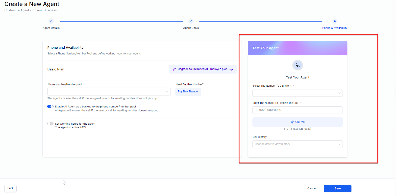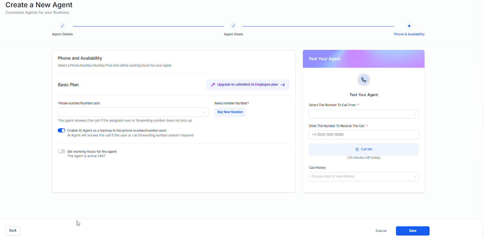 3. Set Working Hours: Define the agent’s availability to handle calls only during specified times.