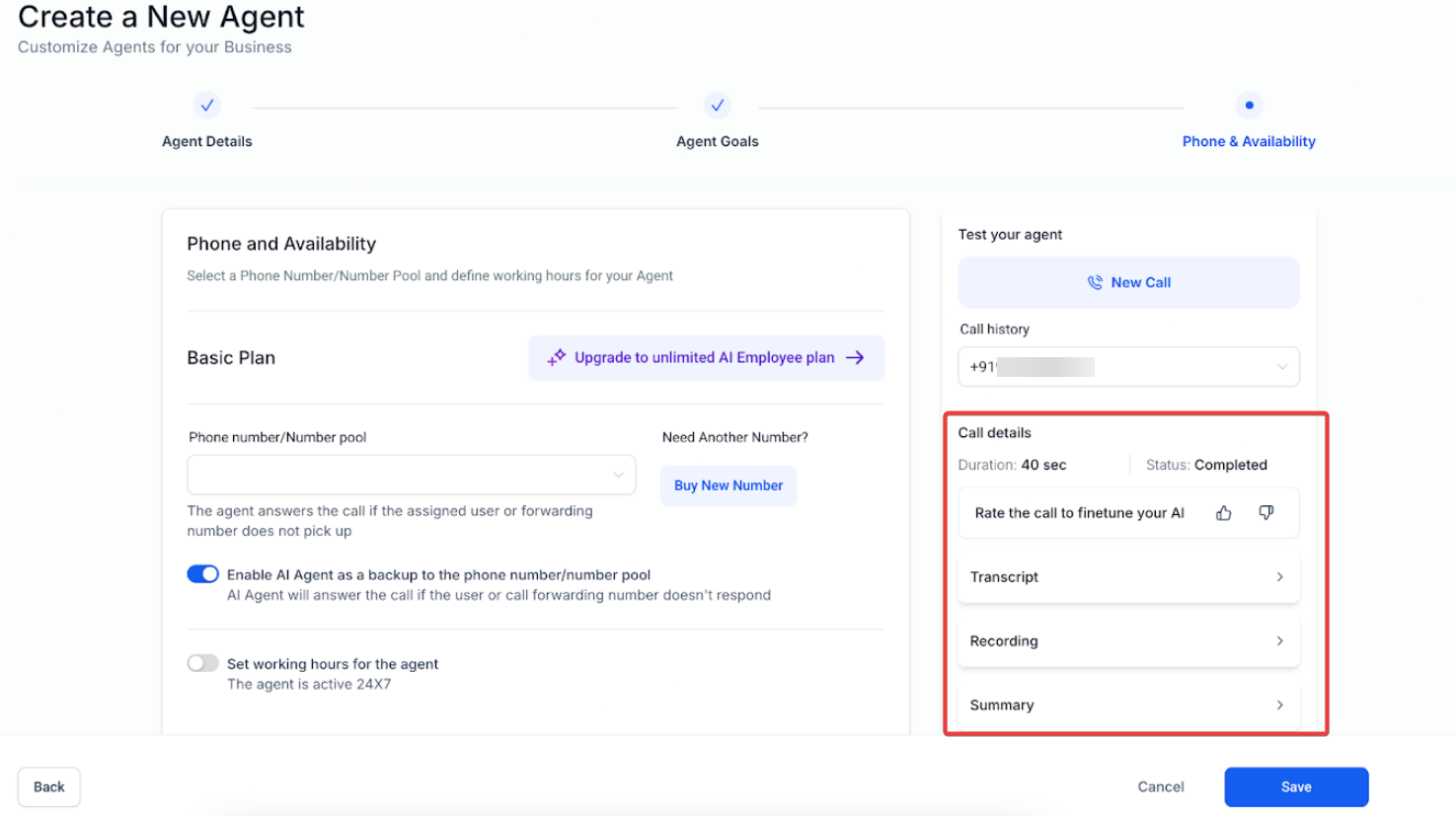 - Availability Management: Set working hours and assign phone numbers, so the AI Agent only handles calls during specific times, allowing your team to take calls when available.