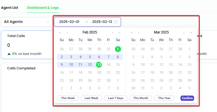 - Customizable Date Ranges and Filters : Options to filter analytics by specific time durations or by individual agents for targeted insights.