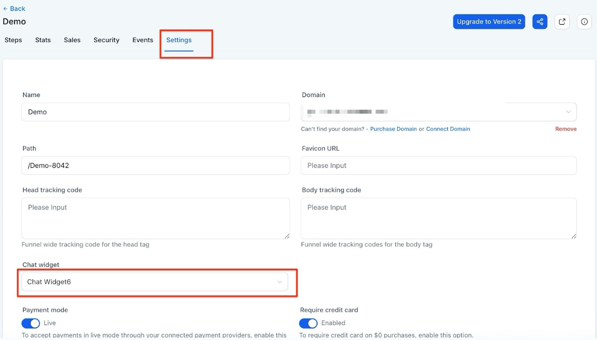 - Go to its Settings. Select the Chat Widget to be added from the drop-down.