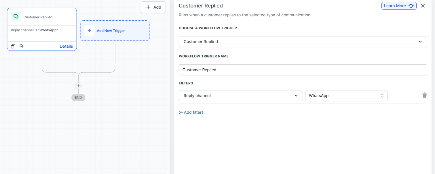 - Trigger: Customer Replied (Channel = WhatsApp)