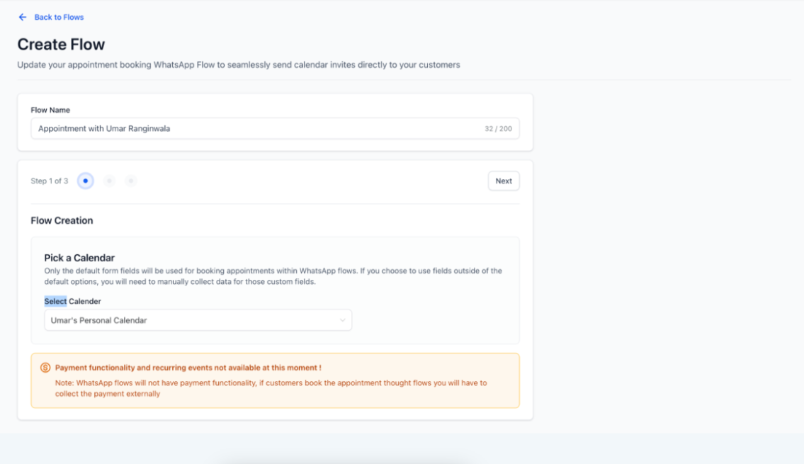 Note: Calendars with payments enabled are not compatible with WhatsApp flows, as WhatsApp currently lacks payment capabilities.