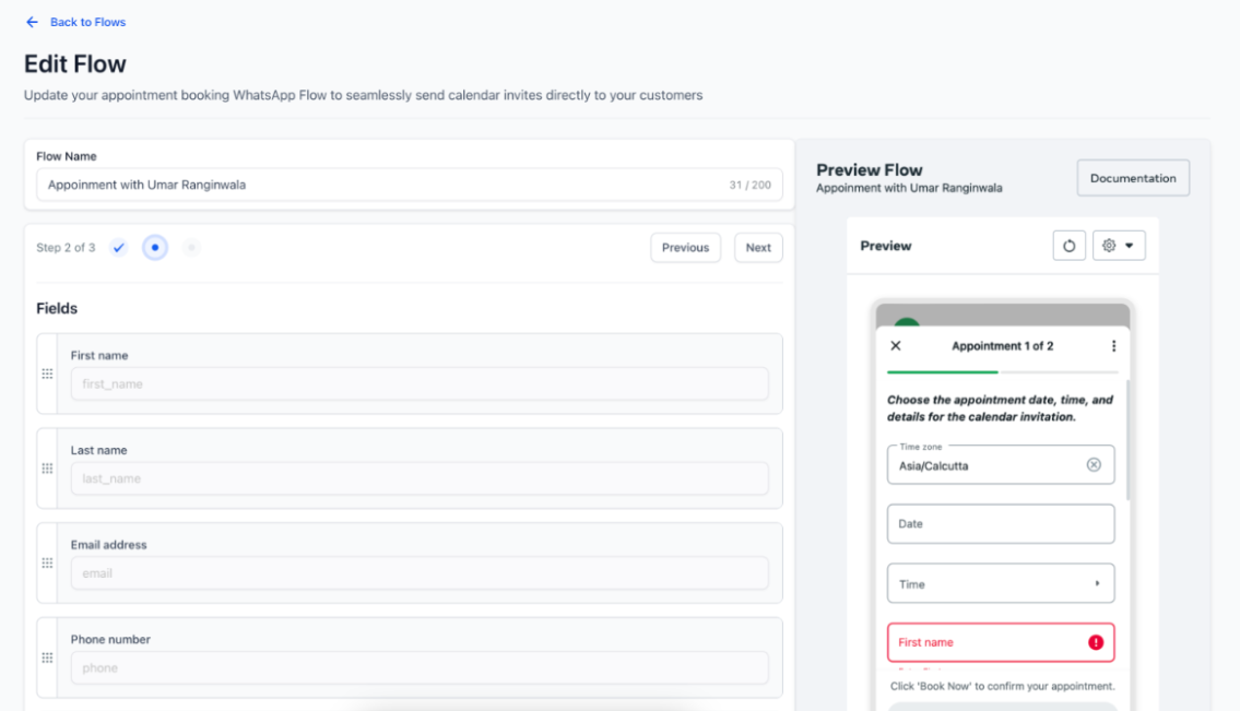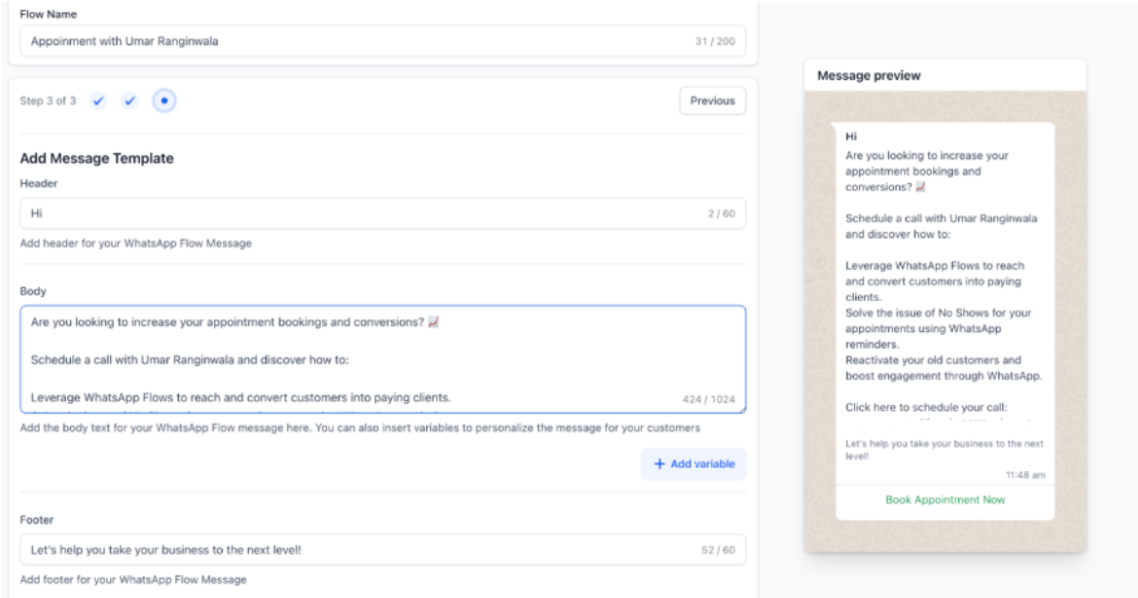 Section titled “How to Use WhatsApp Flows for Appointment Booking”- Setting Up the Flow: