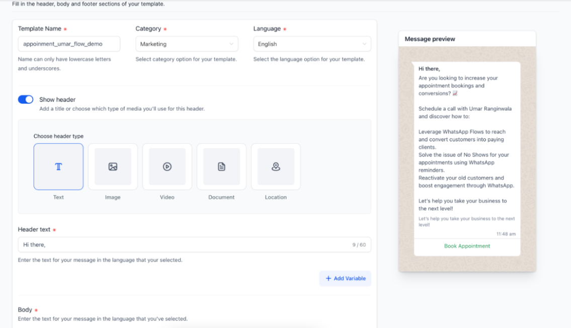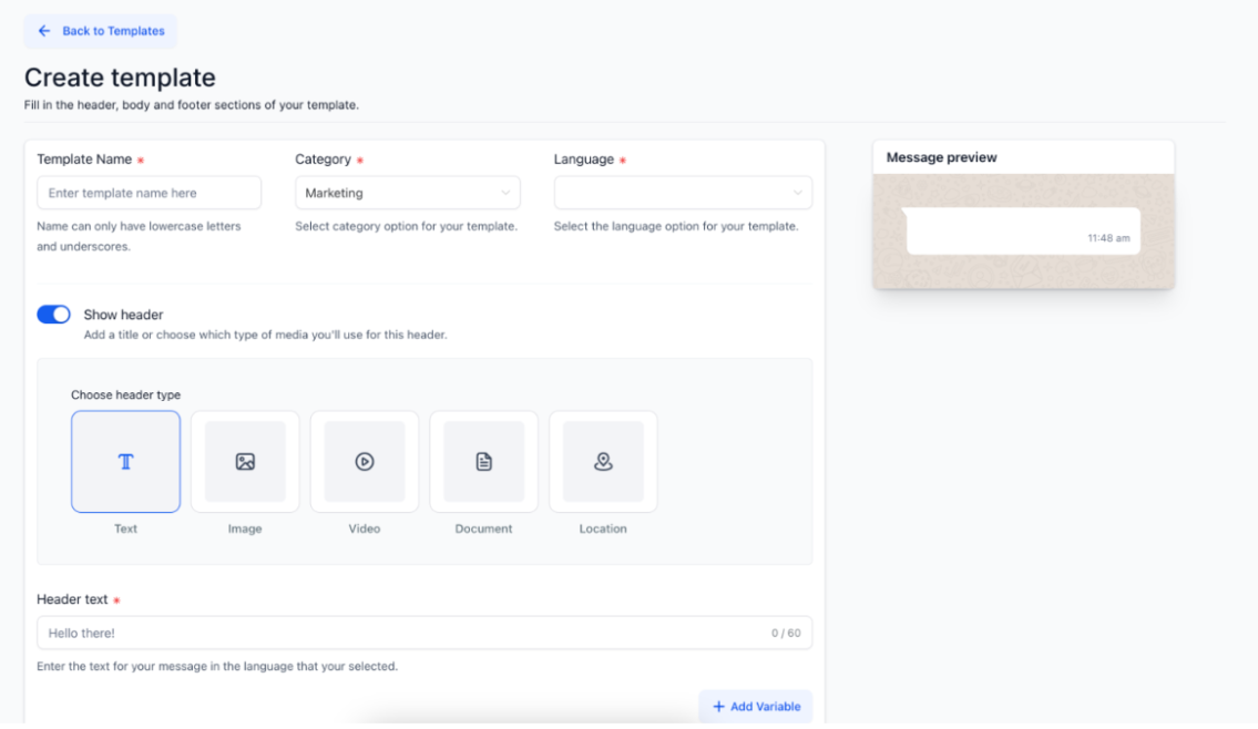 - Name your template, choose its category and language, and then fill out the header, body, and footer sections.