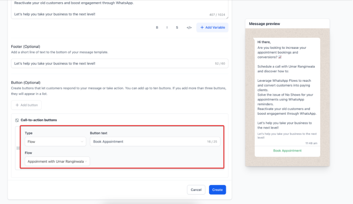 - Add a button, select “Flow,” and link it to the appointment booking WhatsApp Flow.