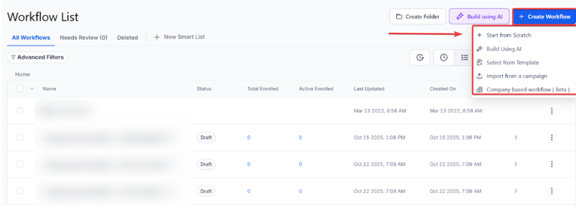 - Go to Automations > Create Workflow > Start from Scratch.