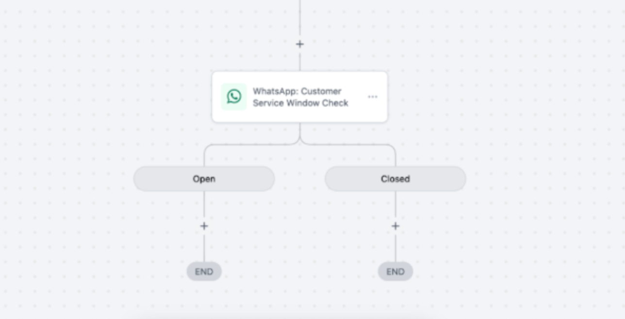 - In a new workflow, select the “WhatsApp: Customer Service Window Check” action.