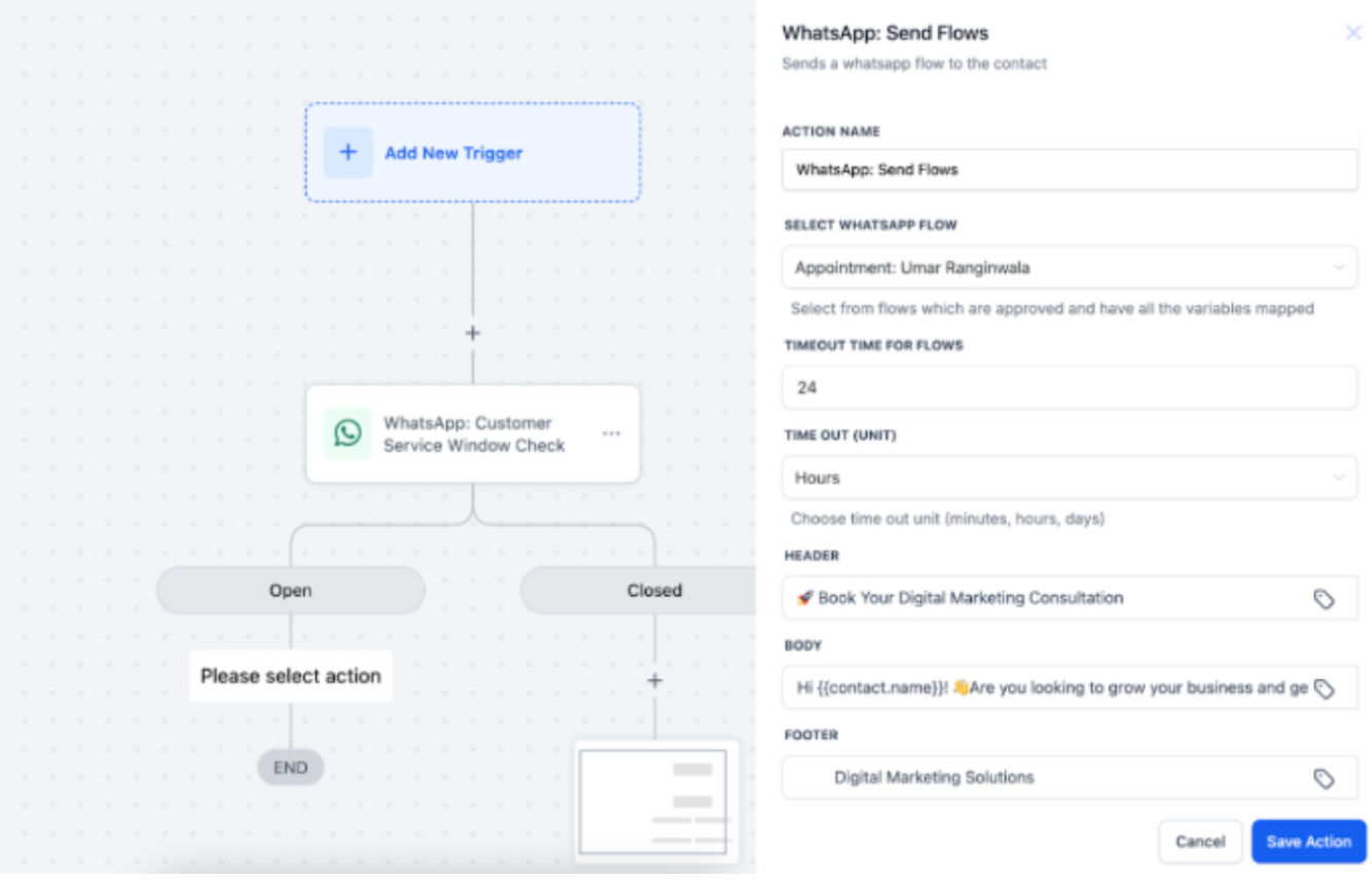 - Choose the appropriate Trigger, select the “WhatsApp” action, and choose the template with the appointment booking flow.