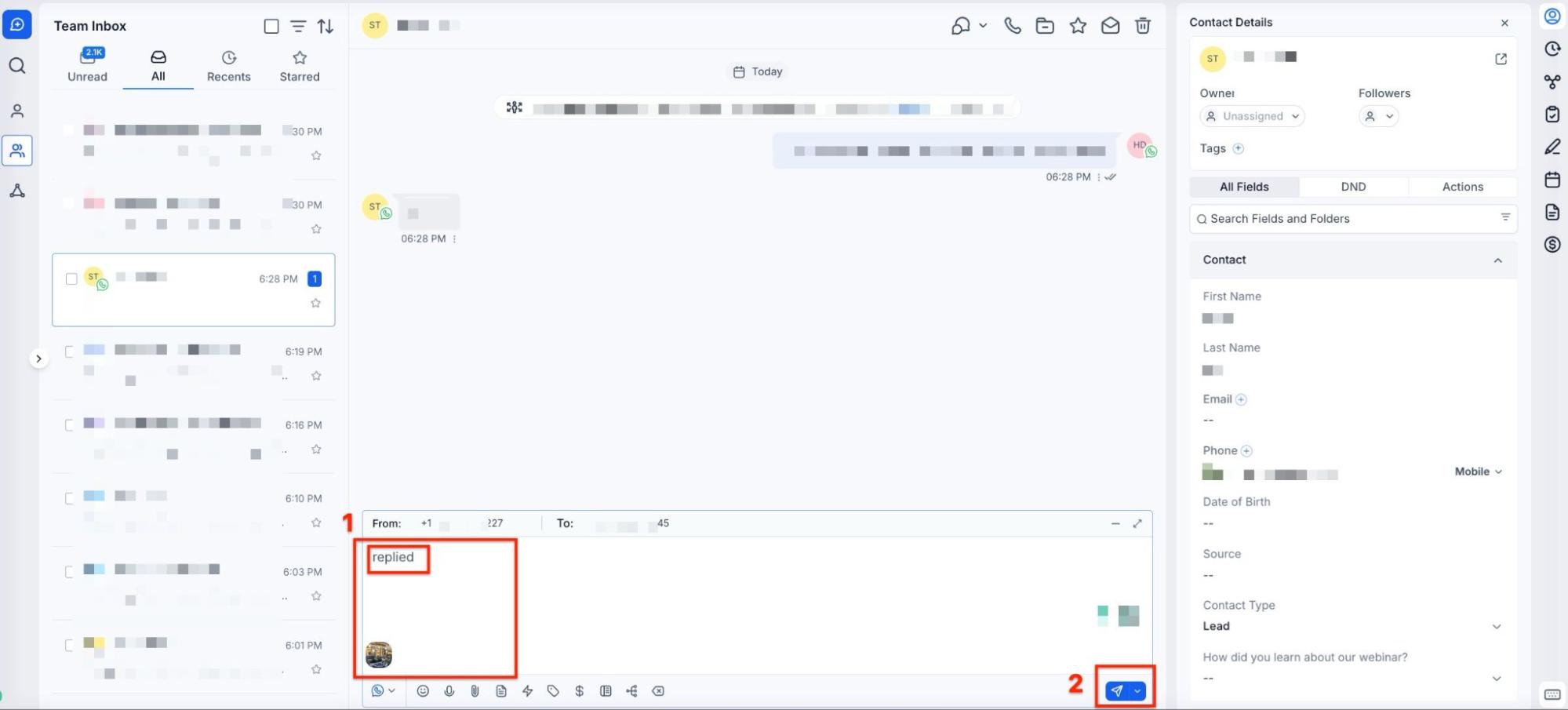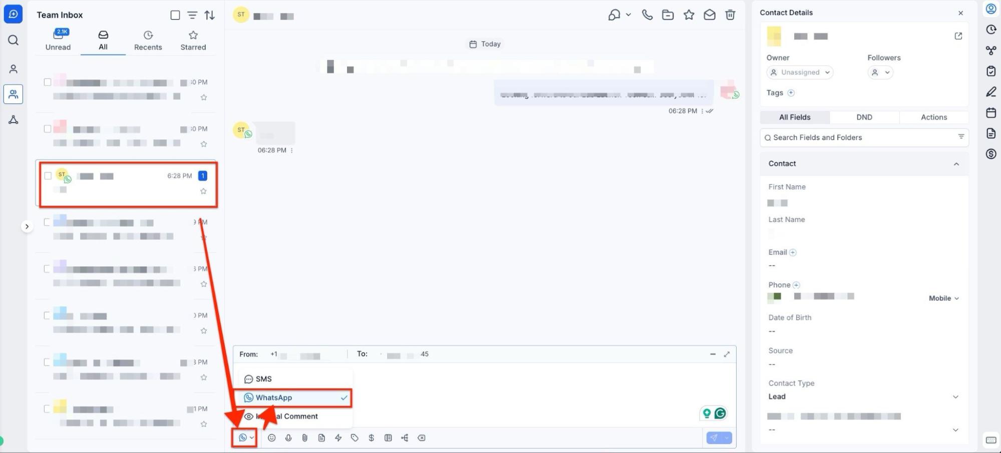 Section titled “How to Use Rich WhatsApp Media Messaging”1. Navigate to Conversations: Open the relevant contact thread within the conversation dashboard and ensure that the messaging option is toggled to WhatsApp (as shown in the screenshot below).