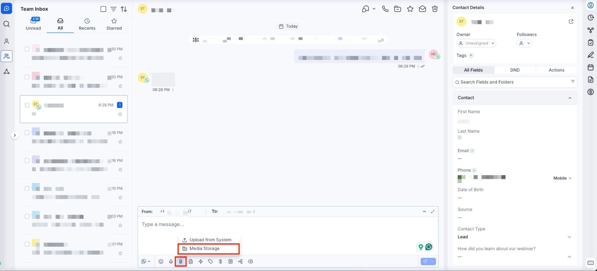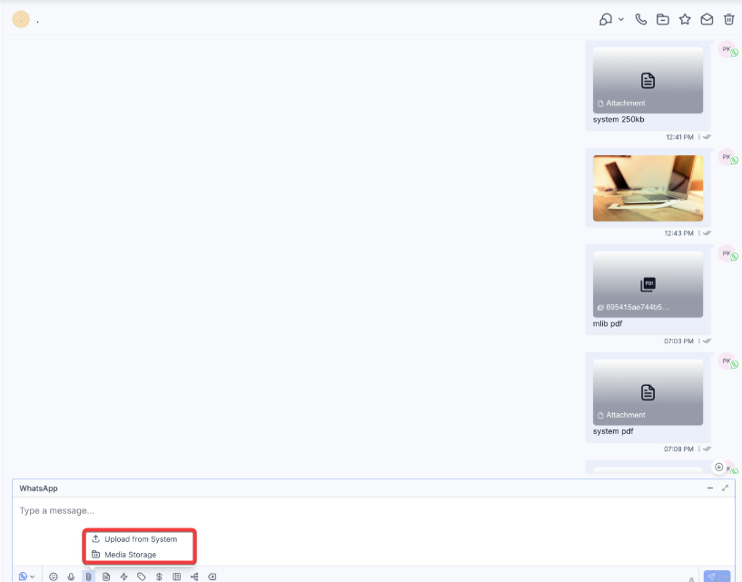 2. Select Media Source: Click the attachment icon in the composer. You may choose to upload a file directly from your local device or browse your existing Media Storage.