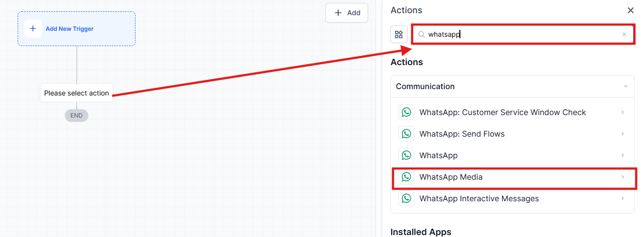 2. Search WhatsApp Media: Locate the WhatsApp Media action within the available options.