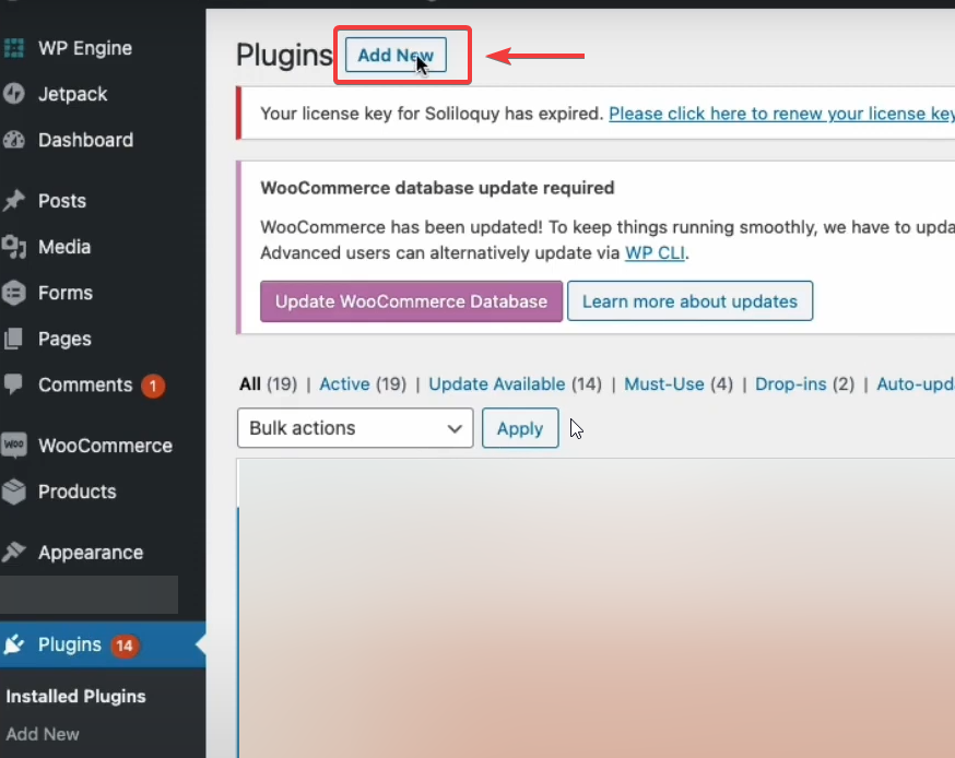 Section titled “Step 1: Add the Plugin”- Navigate to the plugins tab and then click on the Add New button.