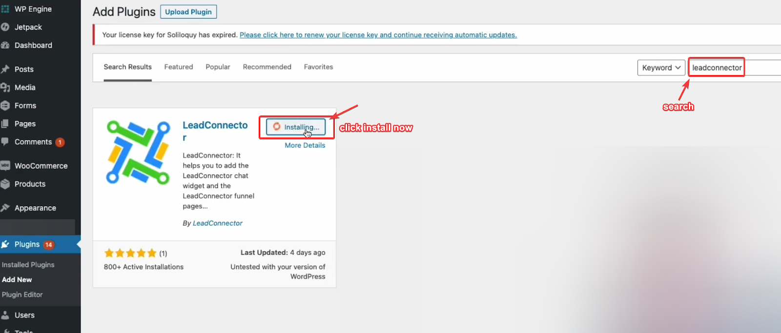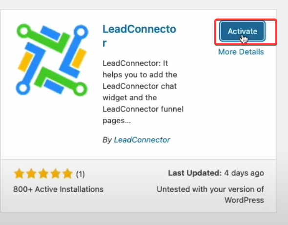 Question: How do I add the LeadConnector plugin to WordPress? Answer: Navigate to the Plugins tab in WordPress, click “Add New,” search for the LeadConnector application, install it, and activate it.