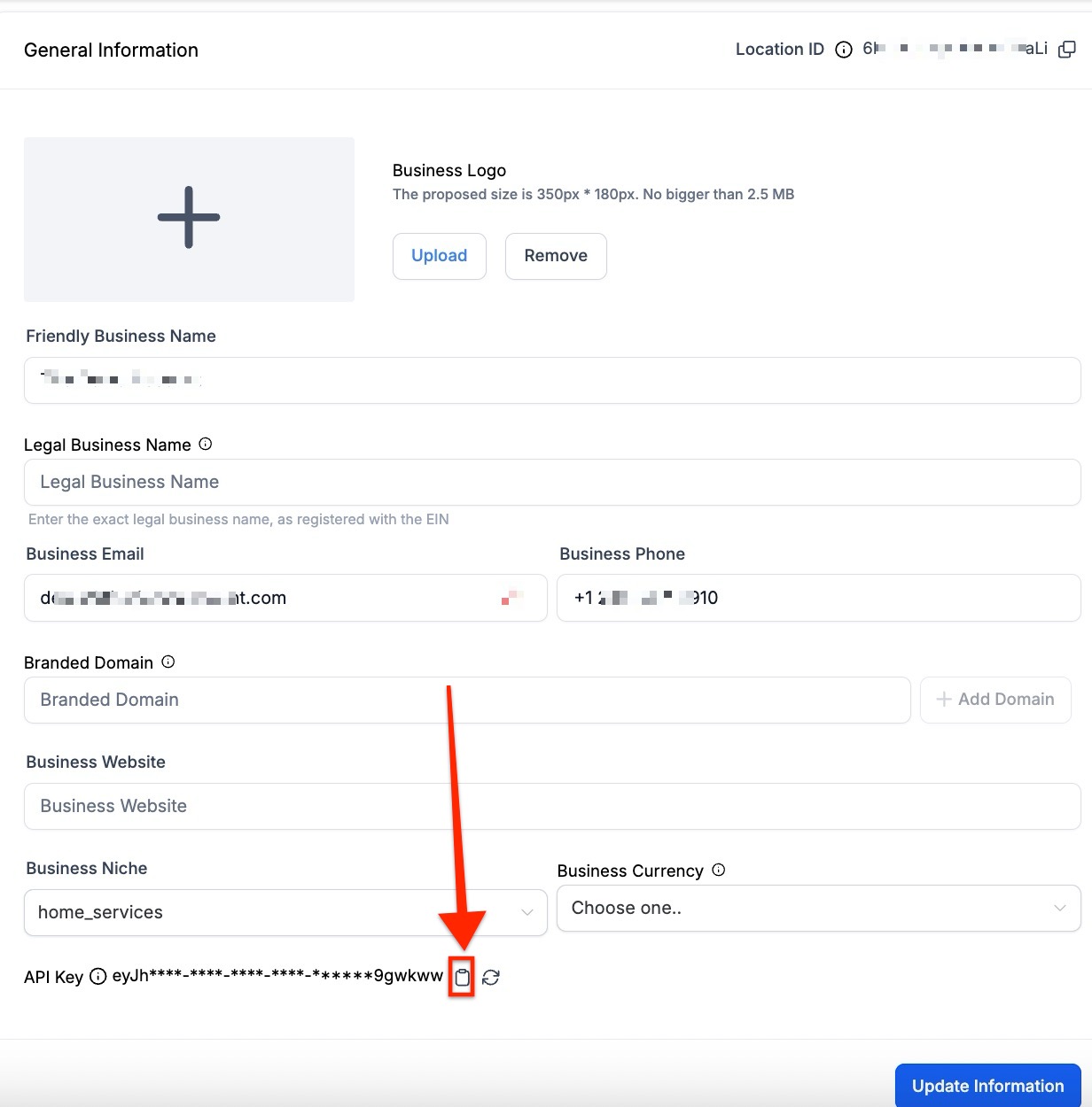 Section titled “Step 2: Copy and paste the API key from the system into WordPress.”- Navigate back to the Settings, go to the Business profile, and copy the API Key.