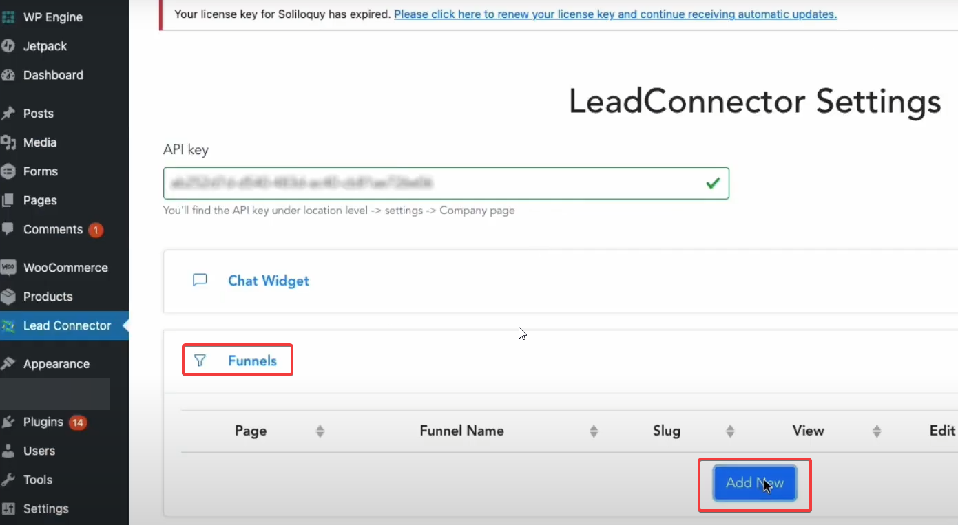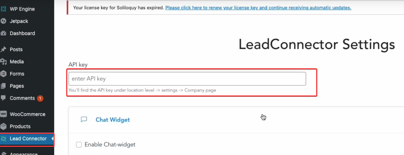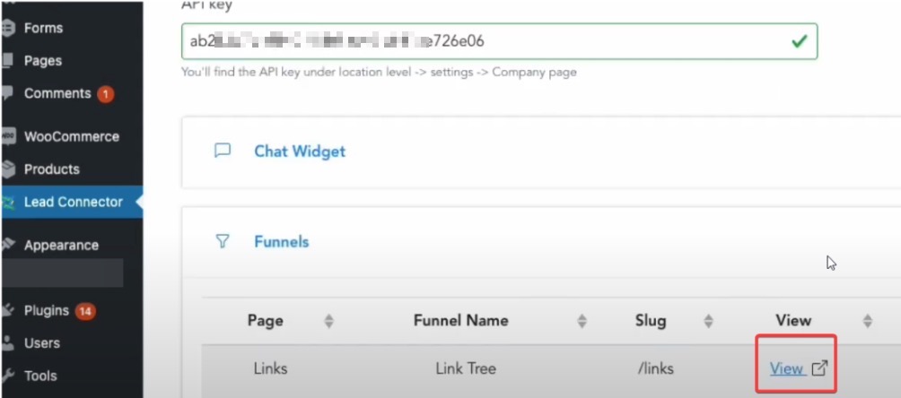 Paste the API key into the correct field within the LeadConnector tab in WordPress and click save.