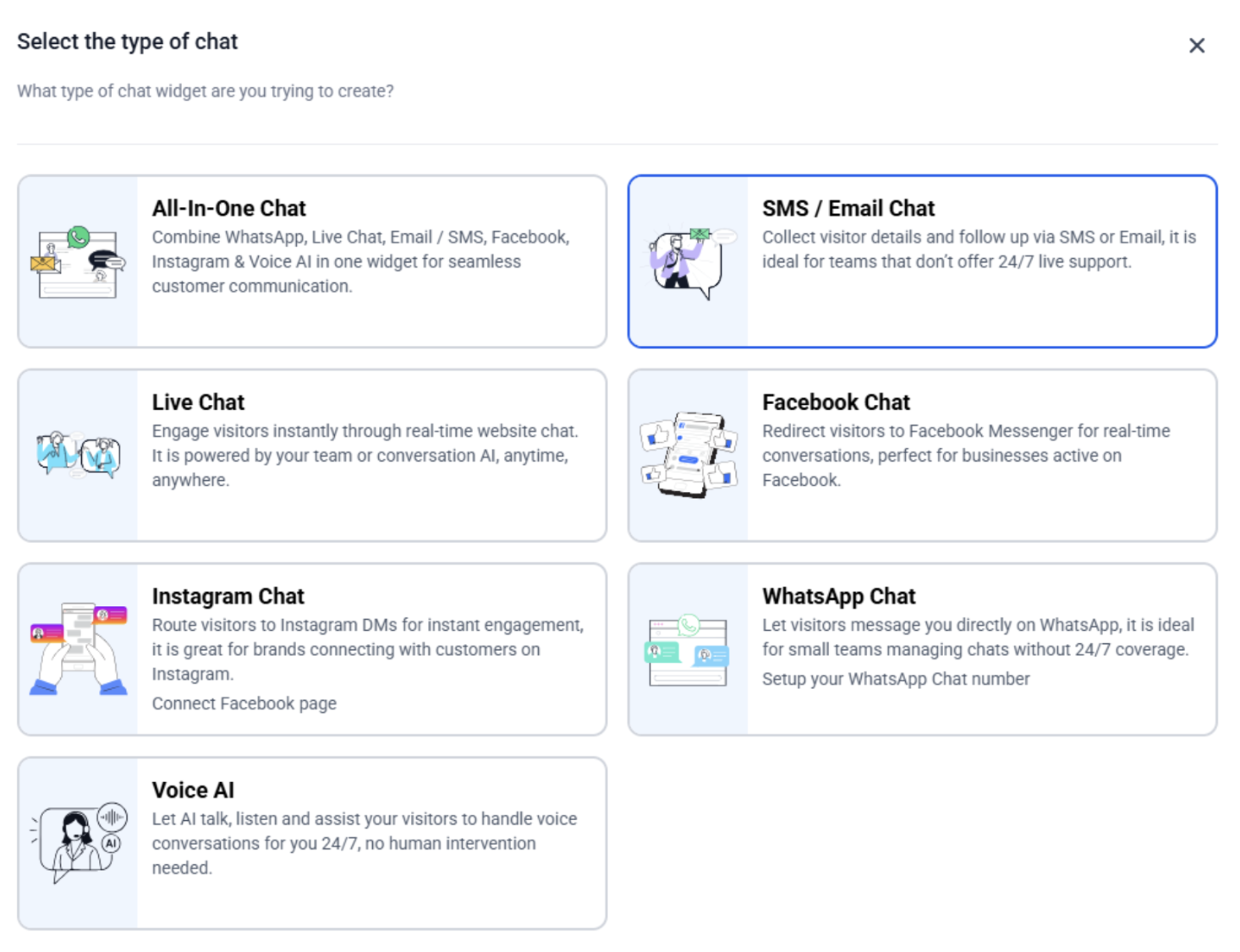 Section titled “SMS / Email Chat”This type of chat widget is designed to collect the visitor’s contact information, allowing your team to respond later via SMS or email. It’s ideal for small teams that may not be available around the clock. With this option, you ensure that every inquiry is captured and can be followed up on, even if immediate responses are not possible.