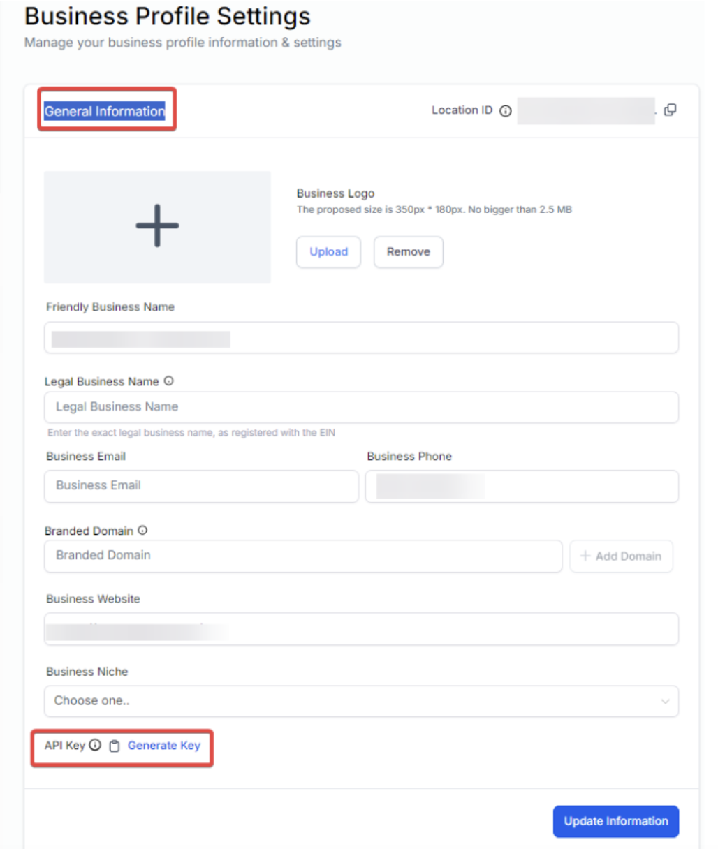 1. In the platform, go to Settings > Business Profile >General Information and locate your API key under “General Information.”