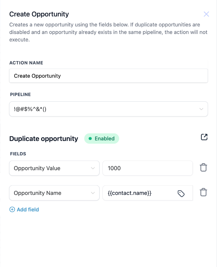 - For “Create Opportunity” or “Update Opportunity,” set relevant fields such as pipeline, stage, name, and value to ensure accurate updates.