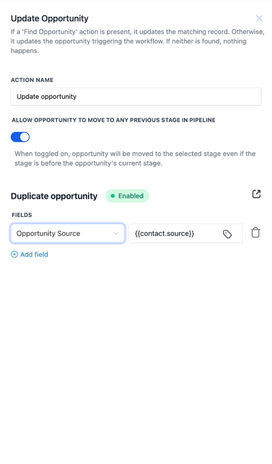 - Use Case: Ideal for onboarding new leads, this feature allows you to automatically populate opportunity details and values. It also unifies the duplicate opportunity setting, ensuring consistency across all processes.