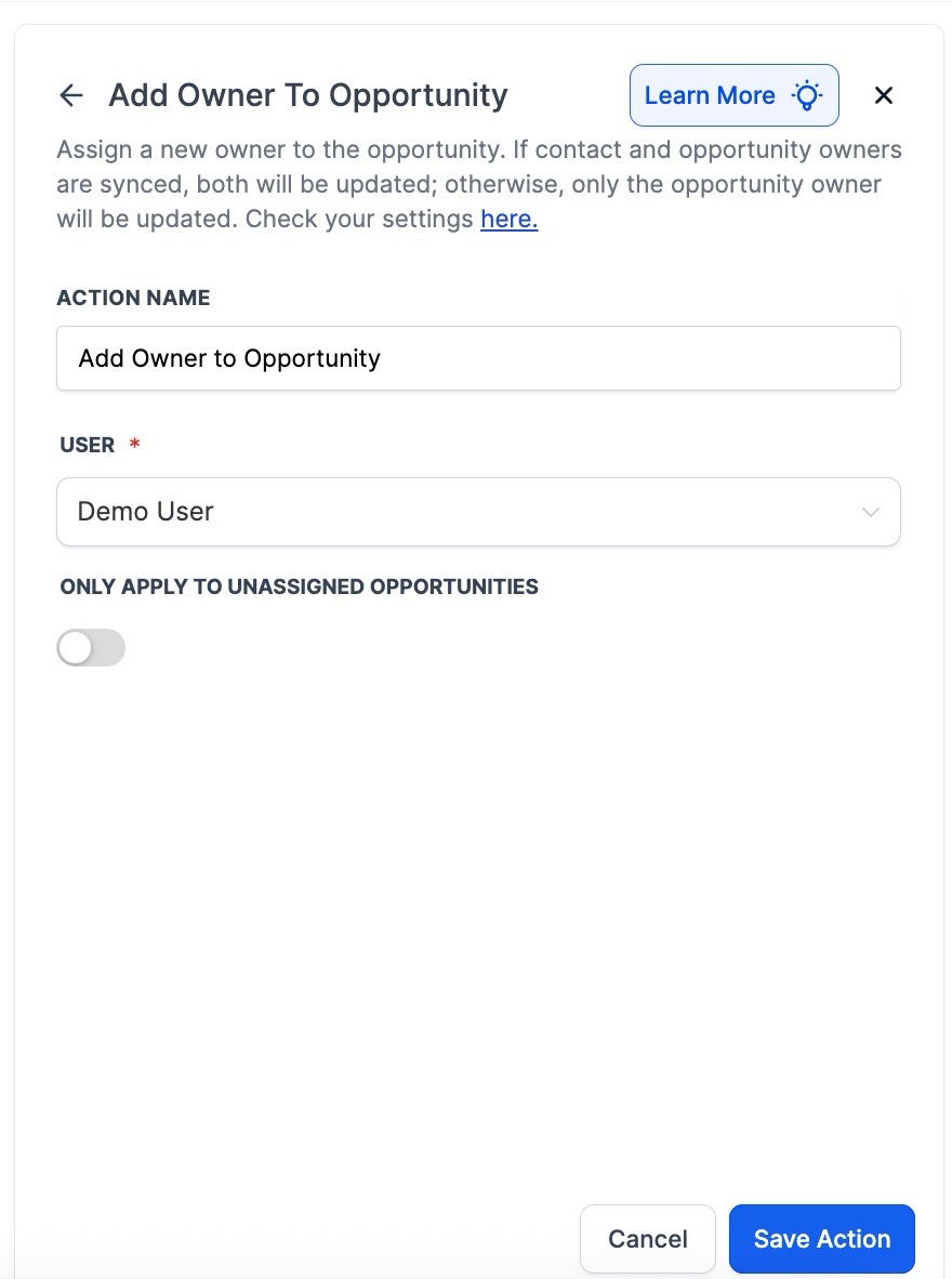 - Benefit: Precisely assign or remove ownership of an opportunity, with optional syncing to the contact owner.