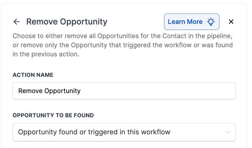 Question: Can I remove multiple opportunities at once? Answer: Yes, the Remove Opportunity action allows you to remove all opportunities within a pipeline or a specific opportunity triggered by the workflow.
