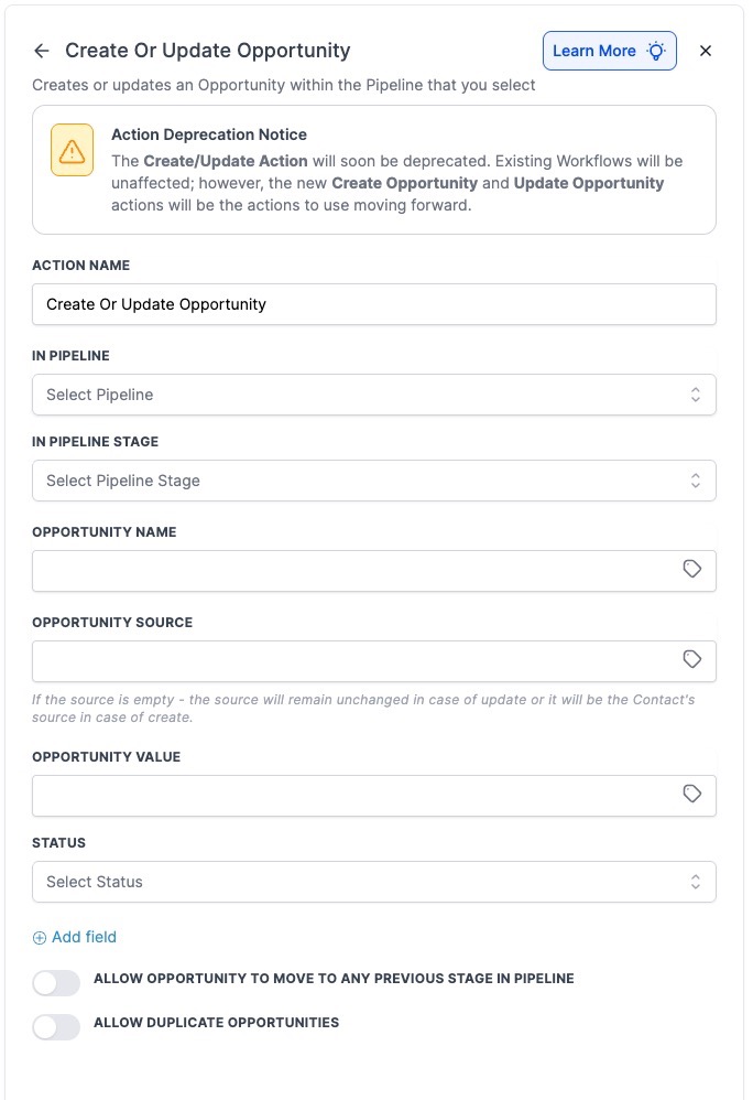 Answer: This action is being deprecated and separated into two dedicated actions: “Create Opportunity” and “Update Opportunity.” While the old combined actions are not being wiped from your existing workflows, transitioning to the separate actions allows for more granular control and ensures compatibility with future enhancements.