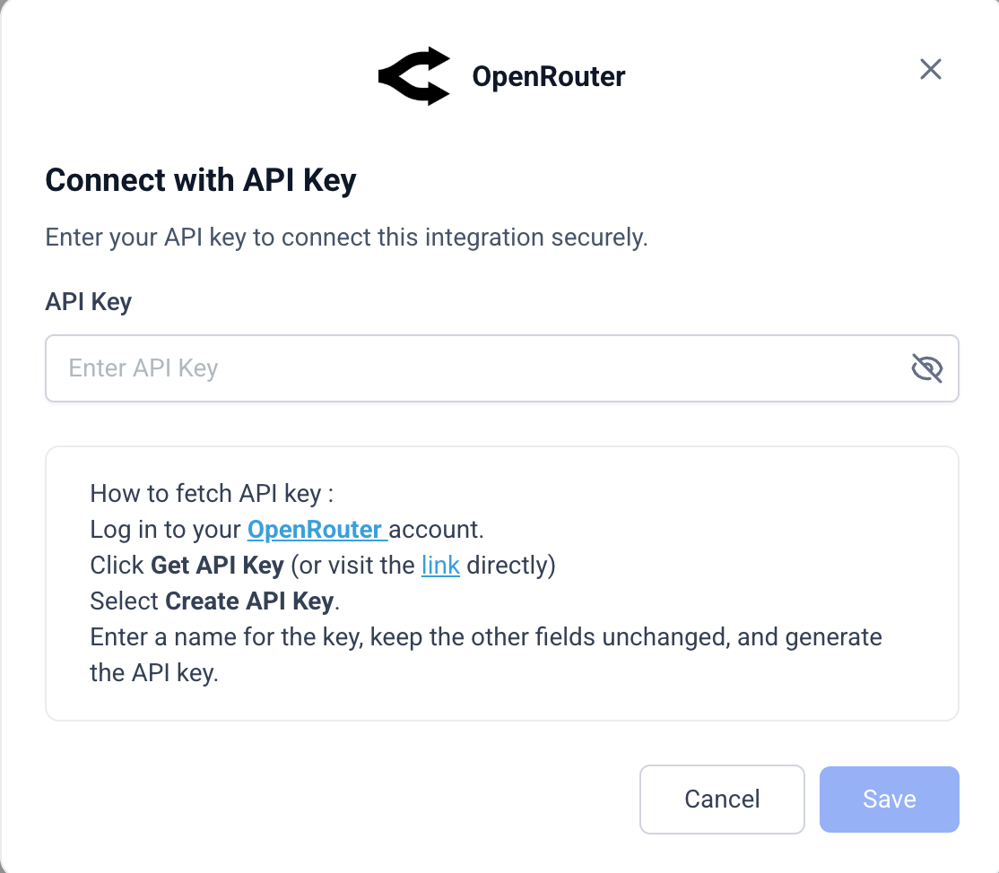 5. To link your account for the first time, click Connect Now and enter your OpenRouter API key.