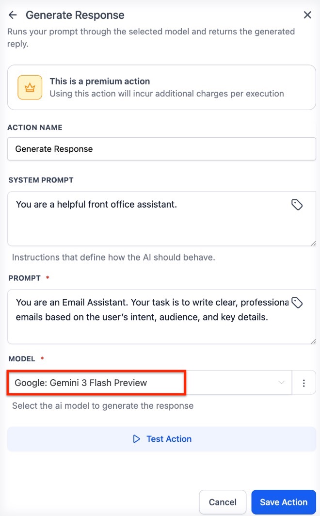 Practical Use Case: Imagine a lead submits a long contact form with several questions. You can use an OpenRouter action to summarize that form into three bullet points. The workflow then saves that summary as a note on the contact record and drafts a personalized email response that addresses the lead’s specific questions automatically.