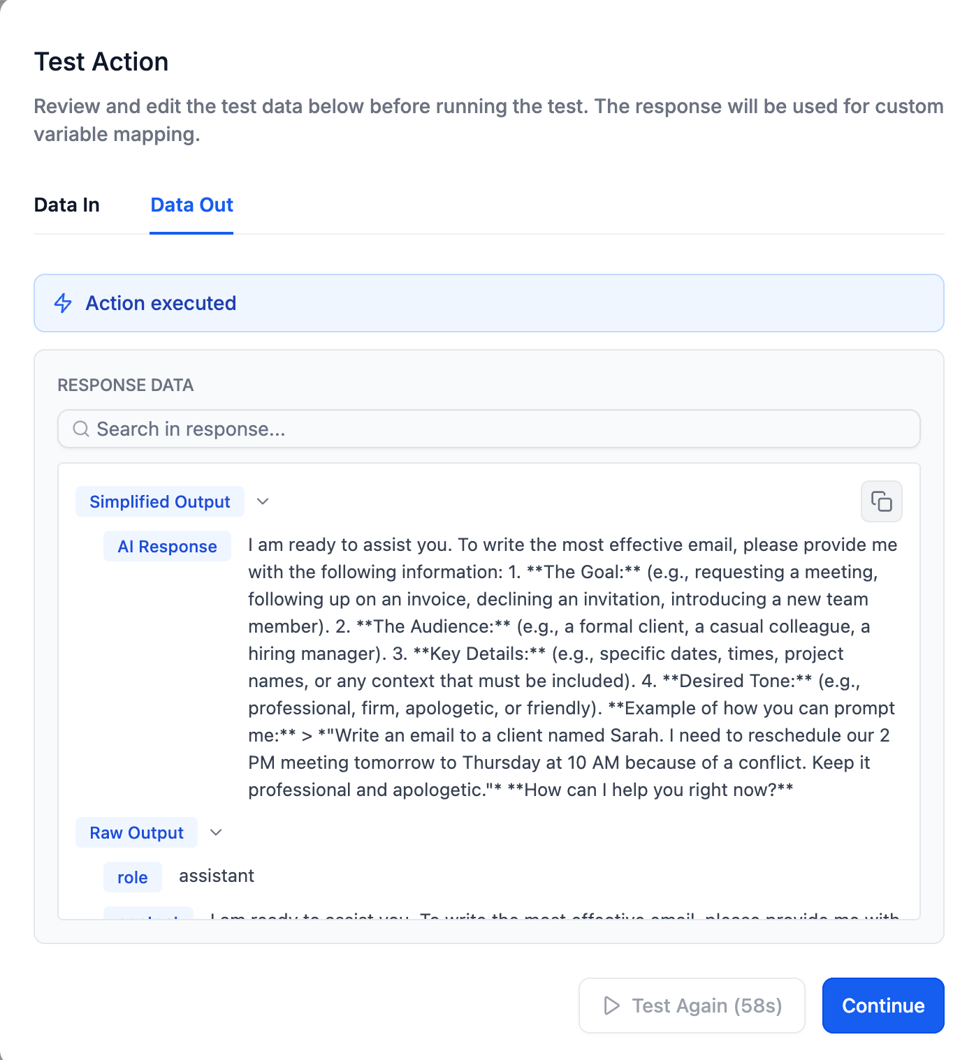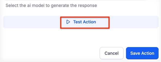 10. To ensure the AI is working correctly, click Test Action to see a sample response and save the data structure for future steps.