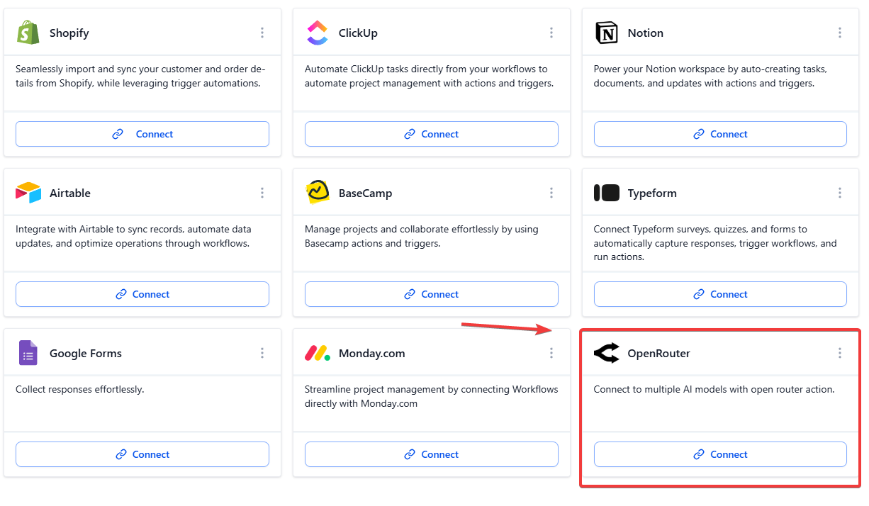 - To find the integration, type “OpenRouter” in the search bar and select the OpenRouter action.