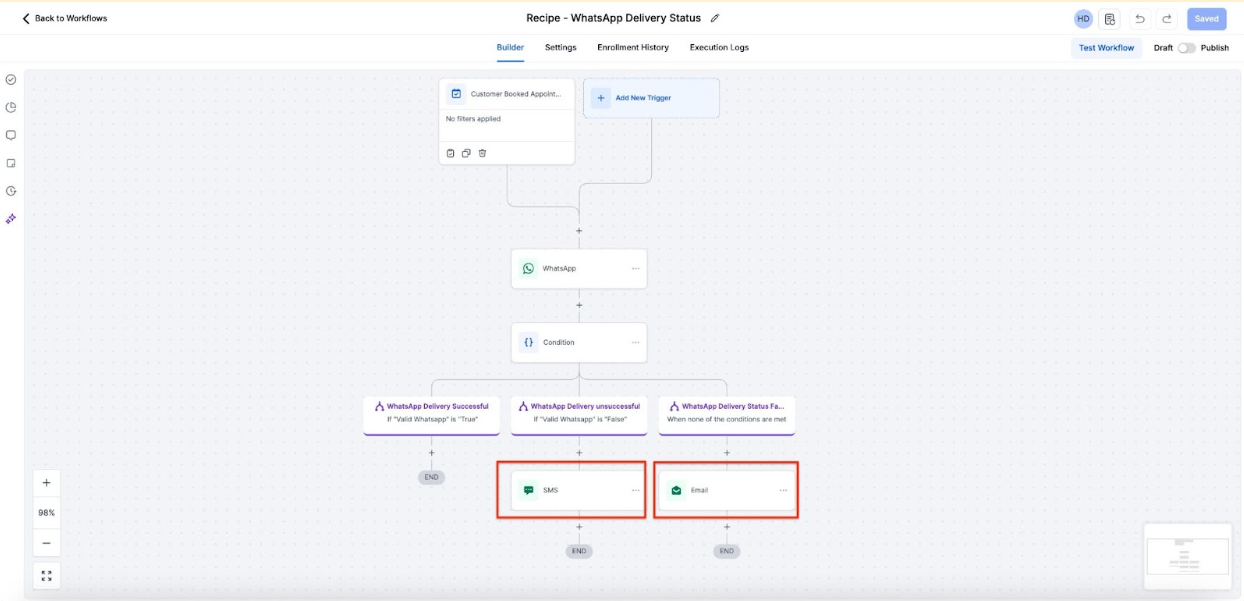 Question: Can I adjust the workflow to send a different message if the WhatsApp delivery fails? Answer: Yes, you can configure the workflow to send an alternative message via SMS and notify your team if the WhatsApp message fails or is not delivered.