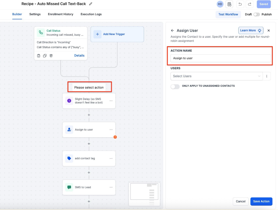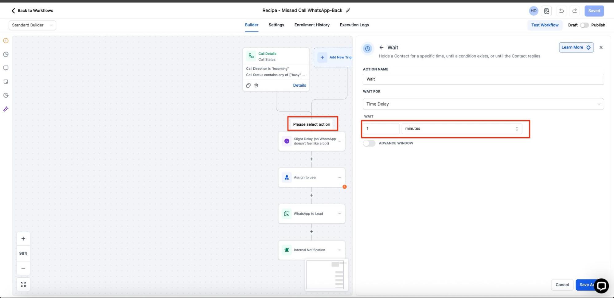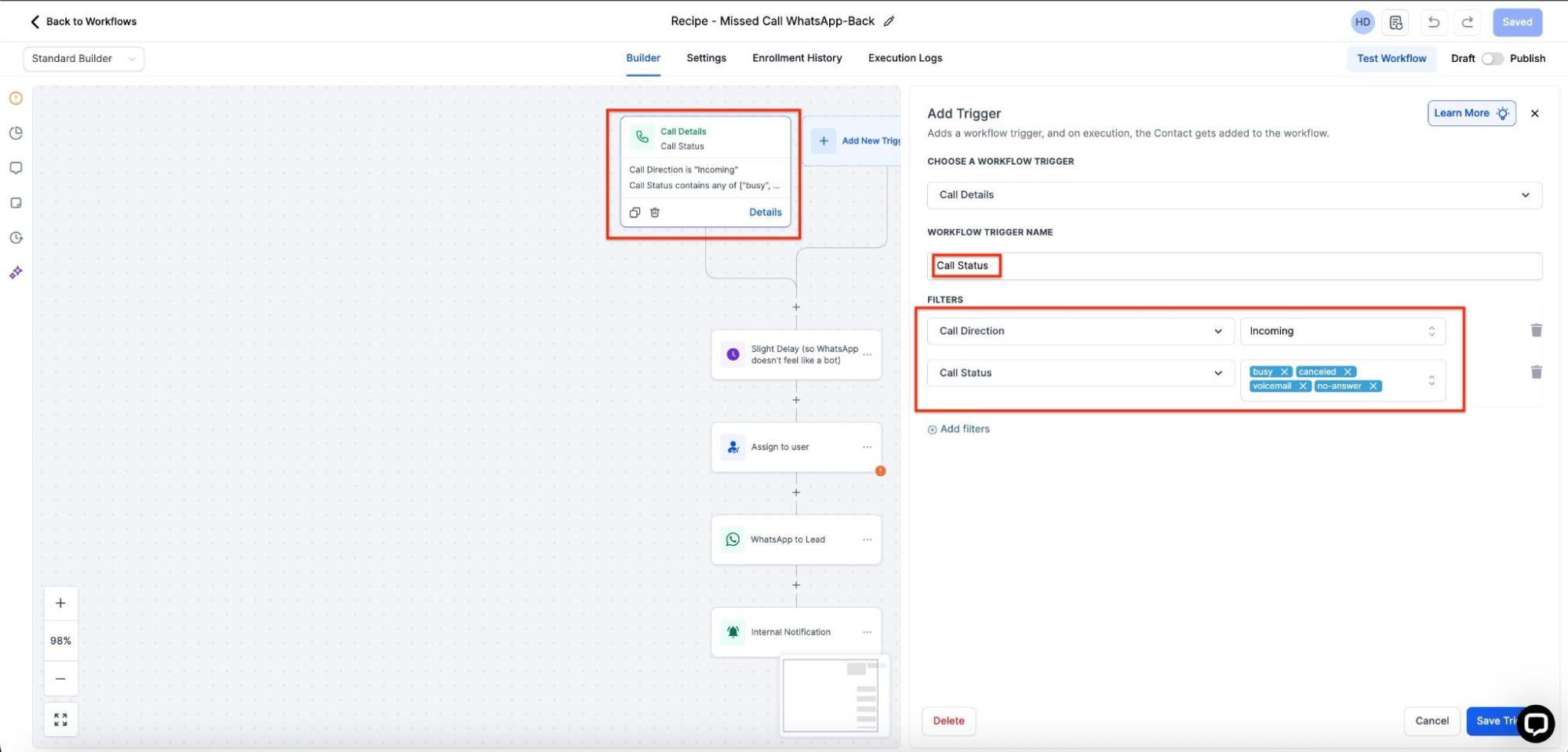 Recipe: Creating Missed Call WhatsApp Back Workflow