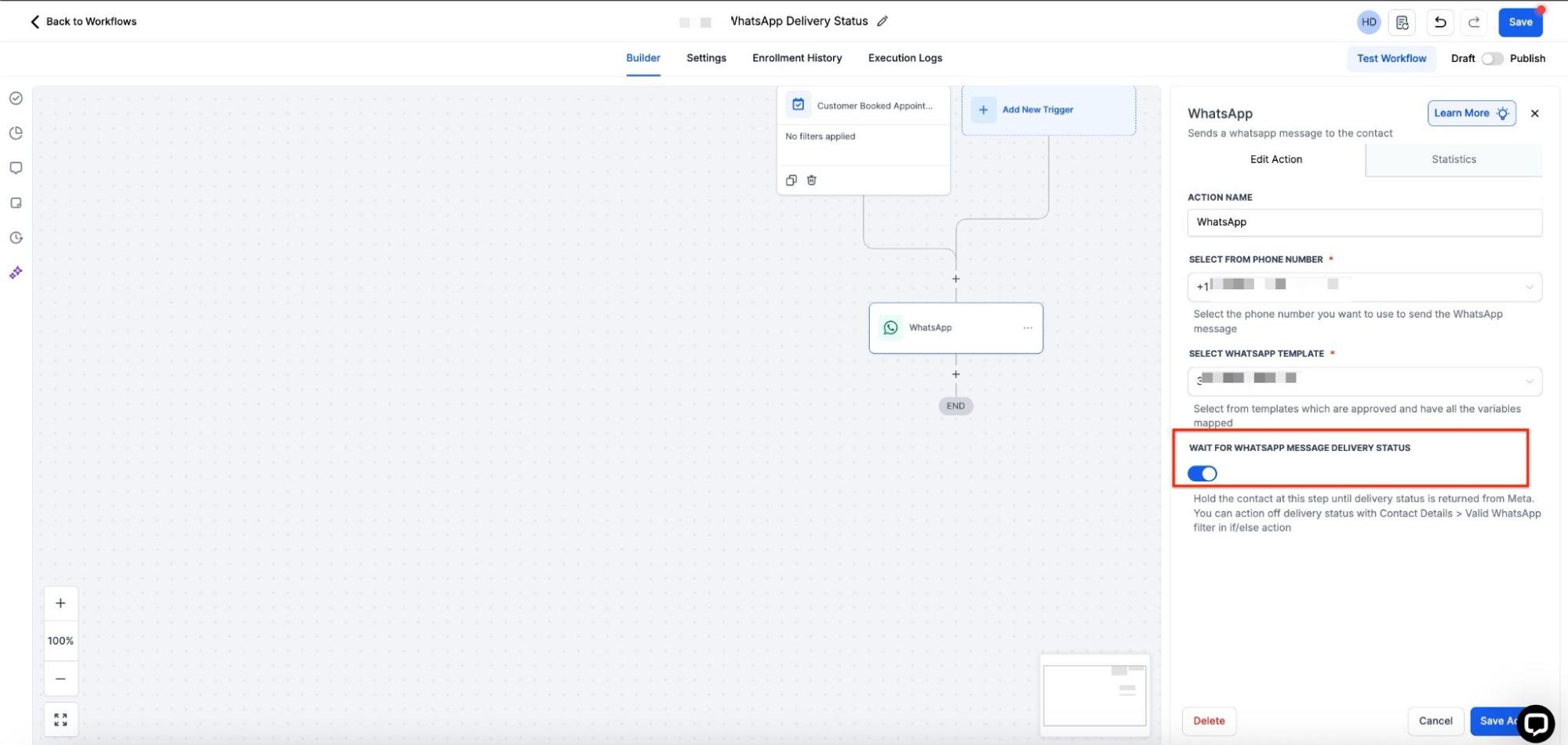 - Enable the toggle WAIT FOR Whatsapp MESSAGE DELIVERY STATUS and save the action.