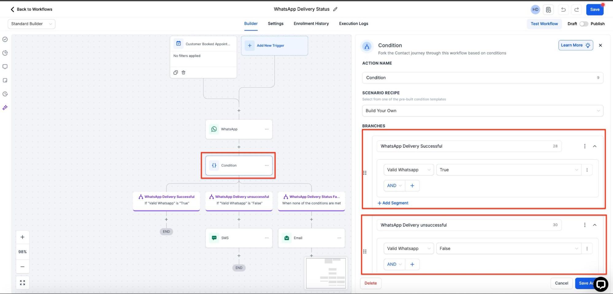 - Select Contact Details > Valid WhatsApp and add conditions for True and False.