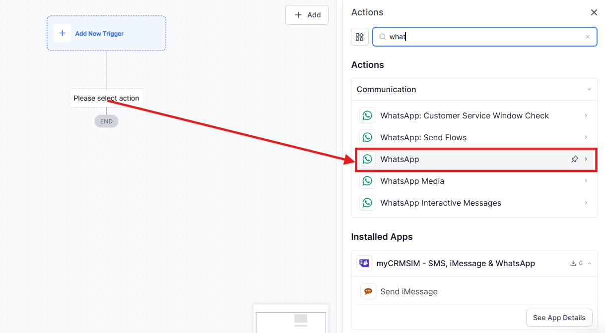 - Choose WhatsApp Action and select the template you want to send.