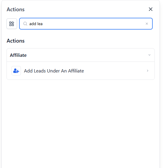 Section titled “Step 2: Add the Action”- Within the workflow editor, choose the action “Add Leads Under an Affiliate.”
