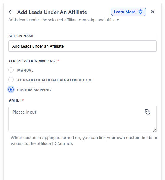 - Custom Mapping: Use if am_id is stored in a custom field or passed as a workflow value. Best for API pushes or third-party integrations.