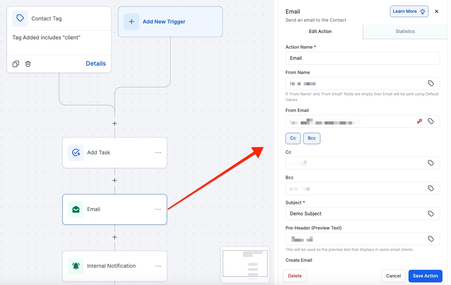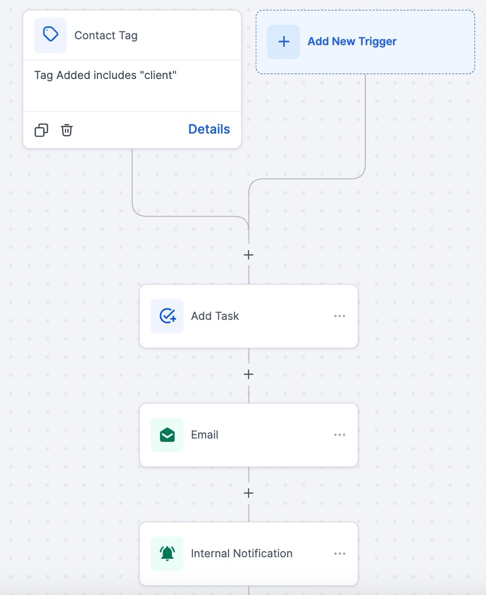 Question: Can I use triggers other than “Contact tag”? Answer: Yes, you can use any available trigger based on your needs, including other contact-related triggers or even no trigger at all. Customize the workflow according to your specific requirements.