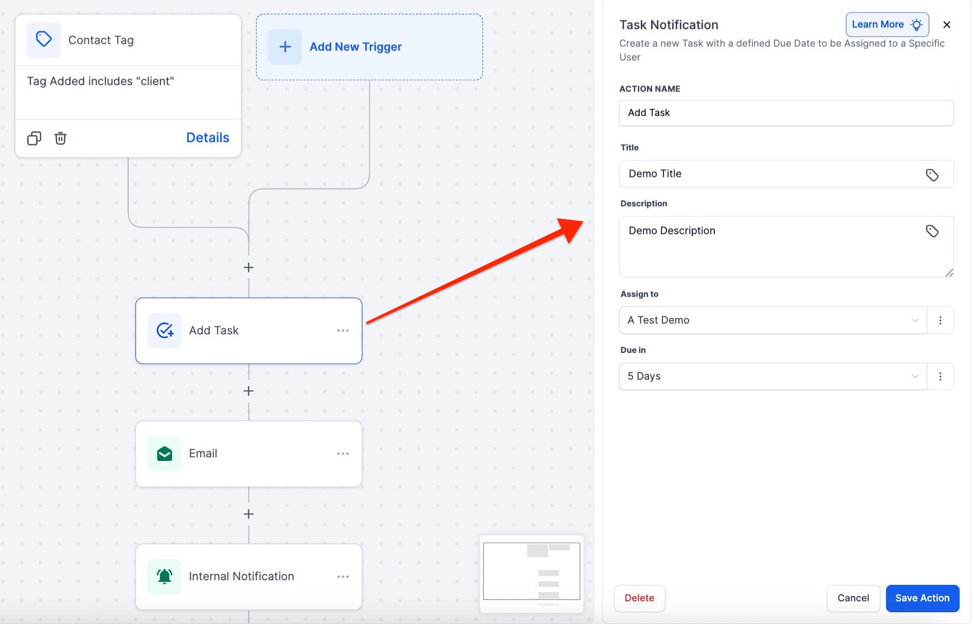 Adding a task to contact an assigned user can be automated. For example, you could add the tag “ultimate task” to a contact, which would cause the system to automatically add this task to the assigned user’s contact page and notify both of them. In this article, we will review the Add Task action and how to use it.